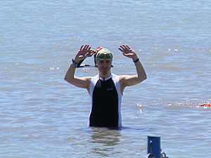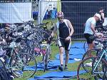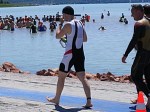 Pár perc után beállt egy egyenletes tempó, és innentől kezdve az úszás igazából eseménytelen volt. Háromszög alakú volt a pálya, tehát két bóját kellett megkerülni, és 3 darab 300 méter körüli egyenest úsztunk. A sebességemet nem tudtam mérni egészen az első bójáig, akkor ránéztem az órára, és tudtam hogy tartom a célnak kitűzött 3 perces tempót. Minden kellemes volt, az ég kék, szél nem fújt, csak a kísérő motorcsónak vetett néha hullámokat. 30:04 lett az úszás vége, minden a terv szerint alakult. A vízből kibotorkálva betoltam a zsebemben alaposan megmosott zselét, és mentem a depóba. A bringák túlnyomó része már nem volt bent, de azért nem csak az enyém állt ott. Gyors lábtörlés, zokni, cipő fel, rajtszám, fejvédő, és már mentem is ki a depóból. Azért 3:23-at csak eltöltöttem ott, ez a távhoz képest sok, de én ezen nem akartam spórolni. Zokni nélkül nem tekerek, azt felvenni volt talán a legtöbb idő. És a helyváltoztatásnál sem szaladtam ki a lelkemet, inkább lazán kocogtam be a depóba, majd ki onnan.
