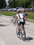 A depóból kijutva végre elkezdődött a tekerés. Egy keskeny úton jutottunk ki a főútra, rendőrök zárták a forgalmat, minden jó volt. Innen kezdődött a pálya érdemi része, egyből egy kisebb emelkedővel. A max. pulzust a verseny rövidségére való tekintettel 160-ra lőttem be, úgy éreztem ezzel lesz valami sebességem, de nem is ölöm le magam a futás előtt. Ennek megfelelően mentem, ha előzni kellett akkor előztem, ha lelassultam akkor hagytam hogy minél könnyebben megelőzzenek. Nem bolyozós verseny volt, és bár gondoltam hogy a versenybírók nem az AG mezőny végét fogják ellenőrizni, nem akartam bonyodalmakat, hisz egyben tekert az összes táv mezőnye. Egy hülyegyereket többször is megelőztem, aki utána ráállt a kerekemre. Szóltam neki hogy ezt nem kéne, de nem biztos hogy hallotta a fülébe rakott fülhallgatók miatt… Elszakadtam tőle, nem törődve a pulzussal, de felszívta magát, újra megelőzött, és beállt elém 3 méterre. Ezt párszor eljátszotta még, aztán végül lekopott. A bringapályán jó volt a hangulat, és nagy a tömeg.