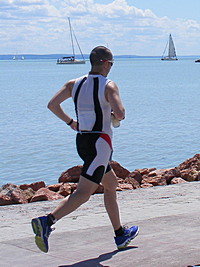 második depózás 2:25 lett, lerakni a bringát, cipőt cserélni, sapkát, futókulacsot felvenni, hát ennyi idő kellett hozzá. De minden klassz volt, frissen kezdtem a futást. A futásnál 165-re terveztem az átlagpulzust, és reméltem hogy ehhez 6:30-on belüli kilométerek társulnak majd. Jött az első, majd a második kilométer, és mind a pulzus, mint a tempó a helyén volt. Élveztem a futást, kicsit sajnáltam a többieket akik lassan megfőttek a hőségben, de én napfürdőztem és futottam. :-)