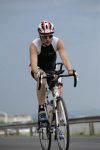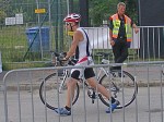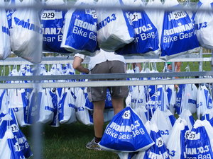 A bringára is csak a cipőt volt szabad felrakni, minden más cucc a BIKE zacskóba került, amit egy beszámozott fogasra kellett felakasztani félúton a víz és a bringa között. A koreográfia úgy nézett ki, hogy kijön a strandoló a vízből, elfut a fogasig, felveszi a zsákot, és befut az öltözősátorba (ami igazából csak alagút volt). Ott felveszi a bringás göncöt, sisakot, rajtszámot, a zacskóba berakja az úszócuccot, és irány a bringa. A zacskót a sátornál elhelyezett ládába kellett dobni, és a szervezők akasztották vissza a megfelelő fogasra.
