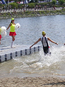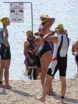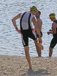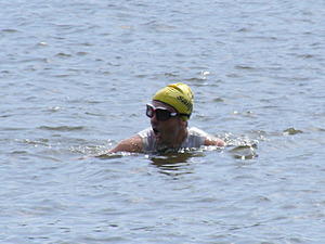 Felraktam a szemüveget, a sapka (és alatta a telefon) már rég a helyén volt, intett a versenybíró, és elindultunk. 6-8 lépés után mélyülni kezdett a víz, a velem együtt indulók már az idejük terhére öblítettek még egyet a szemüvegen, de én már úsztam. Jó volt a víz, nem volt hideg, közel sem volt a neoprén határhoz. A kezdeti izgalom elmúlt, szépen próbáltam beállni a tempómra. A Polar, bár képes víz alatt pulzust mérni, most nem talált jelet, de nem nagyon bosszantottam magam miatta, úgysem tudnék gyorsabban úszni, lassabban meg nem kellett, mert éreztem hogy ez egy kényelmes tempó. Kb. ugyanannyi embert értem utol ahányan engem előztek meg, volt egy kis helyezkedés, de ott hátul már senki nem haragszik senkire.