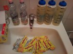 Visszamentünk a szállásra, volt még idő, így bekevertem a kulacsokat. A szokásosnak mondható zselés frissítést terveztem, 20 percenként egy zselé+víz, továbbá óránként két sótabletta. A megoldás is a szokásos volt: kulacsba 6 zselé, felöntve annyi vízzel amennyi belefért. A kulacsra 6 jelzést tettem, egy jelzésnyi folyadék egy 20 perces adag. Ilyen kulacsból csináltam hármat, ennek elégnek kell lennie a bringa teljes hosszára, hisz lesz mellette kóla is. Azért a biztonság kedvéért még a zsebemben is lesz pár zselé, ki tudja mit történik. 3 kulaccsal terveztem elindulni: egy zselés, egy kólás, egy vizes. A vizest 25km-enként tudom cserélni a frissítőállomásokon, a zselést és a kólást Gabiék adják majd fel a körök végén.