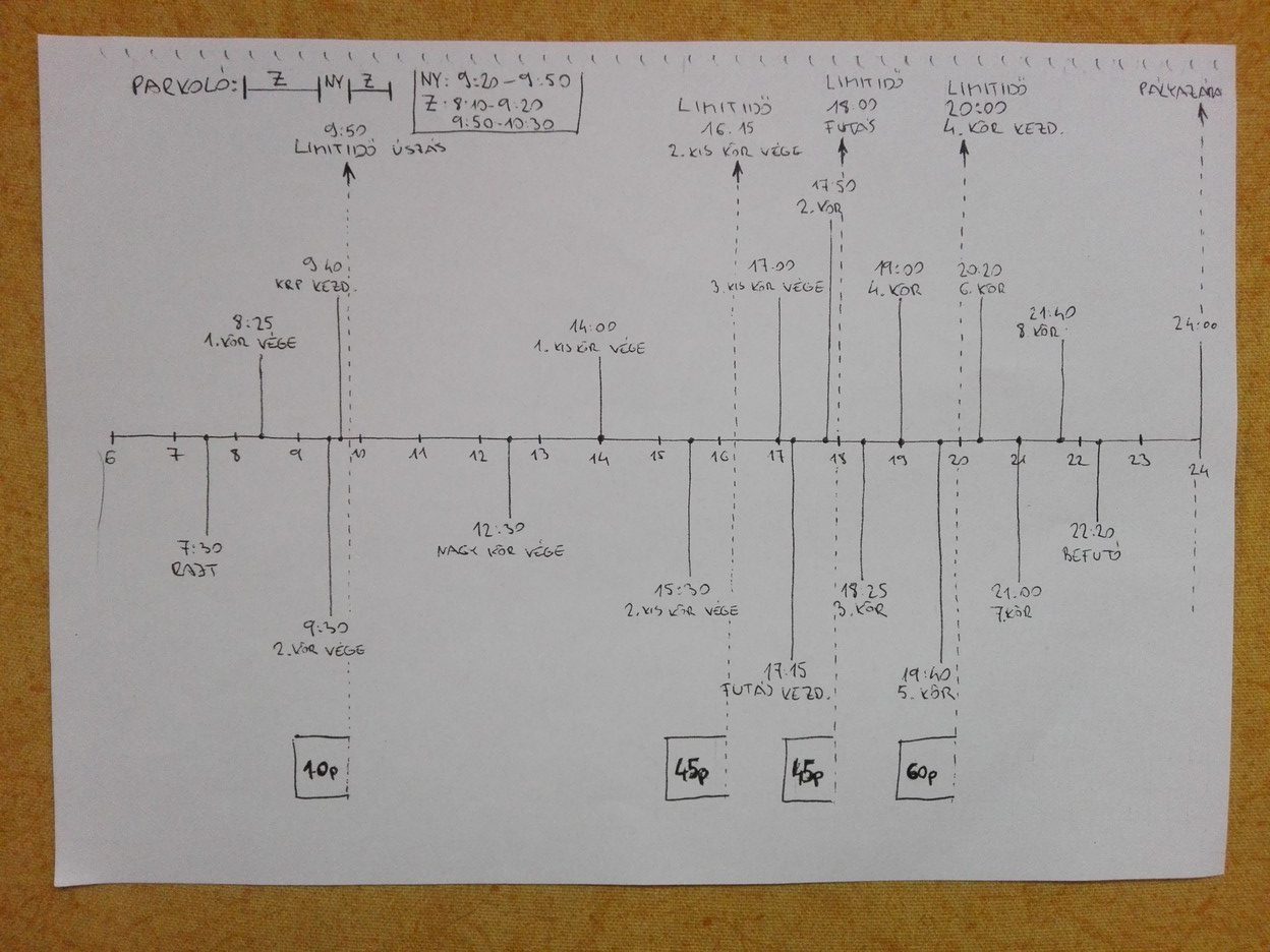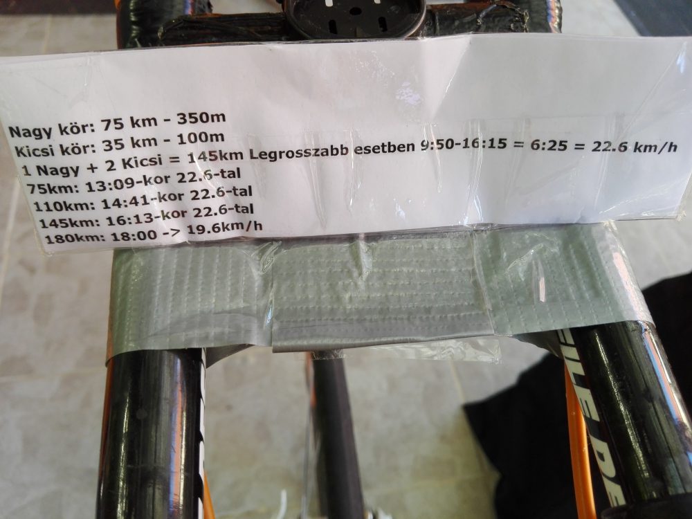 Csak egy tervem volt, egy reális terv, amit ha minden jól megy, és nincs semmi extra szívás, akkor szerintem tartani tudok. Hogy jobban áttekinthető legyen, és a segítőim is képben legyenek, minden alaposan leírtam, konkrét forgatókönyvem volt a szombati napra a hajnali 4-es ébresztőtől egészen éjfélig. Emellett a könyöklőre felragasztottam a pálya szintrajzát és a limitidőkhöz szükséges távokat, átlagsebességeket is. Jó ha ott van, ha van viszonyítási alap.