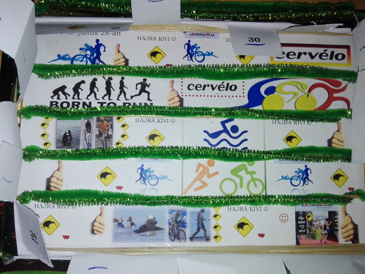 Először is Edit és Eszter, akik a tehetségtelenségem ellenére megtanítottak legalább annyira úszni, hogy a távot biztonsággal teljesítsem. Másodszor pedig Gabi és Tamás, akik kitartóan lesték minden kívánságomat hajnaltól késő estig, és nekik is legalább olyan fárasztó volt az év leghosszabb napja mint nekem. Köszönöm, nagyok voltatok! :-) Gabinak még egy extra köszönet a naptárért: egy triatlonos “adventi naptárat” is csinált nekem, minden keményebb edzés után kibontottam egy ablakot, általában valamilyen jutalomcsoki volt mögötte, amit az utóbbi hónapokban hanyagolnom kellett a fogyás miatt. Novembertől júliusig 78-ról 68 kilóra fogytam, ez sem volt annyira könnyű, de sok holtponton átlendített az a hit, amit Gabi belém vetett a felkészülés során.