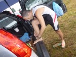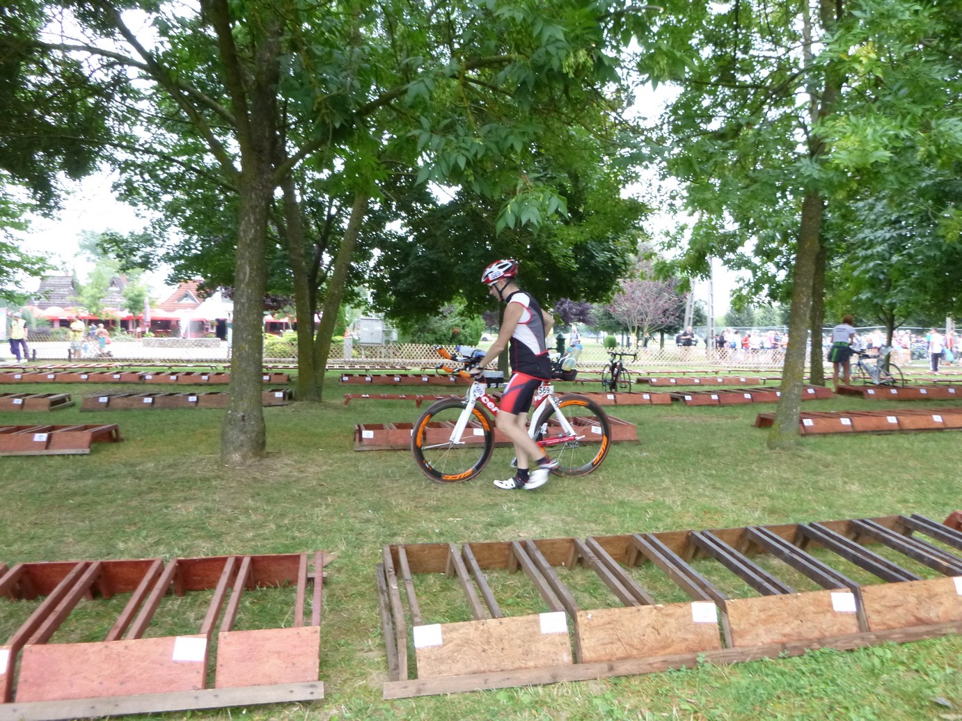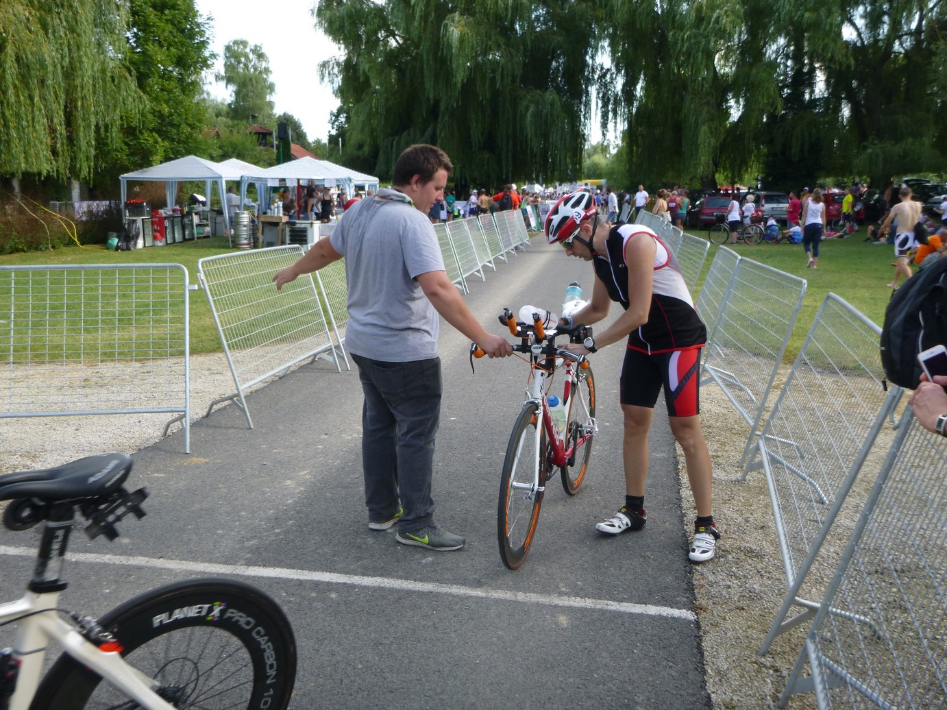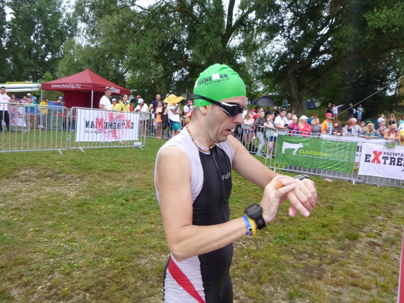 A sátorban ötöd-hatodmagammal öltözöm, többek közt Fröhlich Henrik és Bandi bácsi társaságában. Ők előbb kész vannak, én még szarakodok. Erre a depóra 10 percet szántam, és tudom hogy ez kelleni is fog. A vizes úszóruhát könnyű lecibálni, de nedves testre felszenvedni az aláöltöző mezt és a nadrágot nem annyira egyszerű. Megtörölközöm az erre az alkalomra kapott szerencse-törcsivel, de a levegő párás és hűvös, szóval még 10 percig törölközhetnék, a teljes szárazsághoz. Erre nincs idő, marad a nyögvenyelős öltözés. Azért idővel megvan, már csak zokni, cipő, sisak, szemüveg, és irány a bringa. Az úszócuccot a zsákba rakom, és kifelé menet bedobom a ládába.