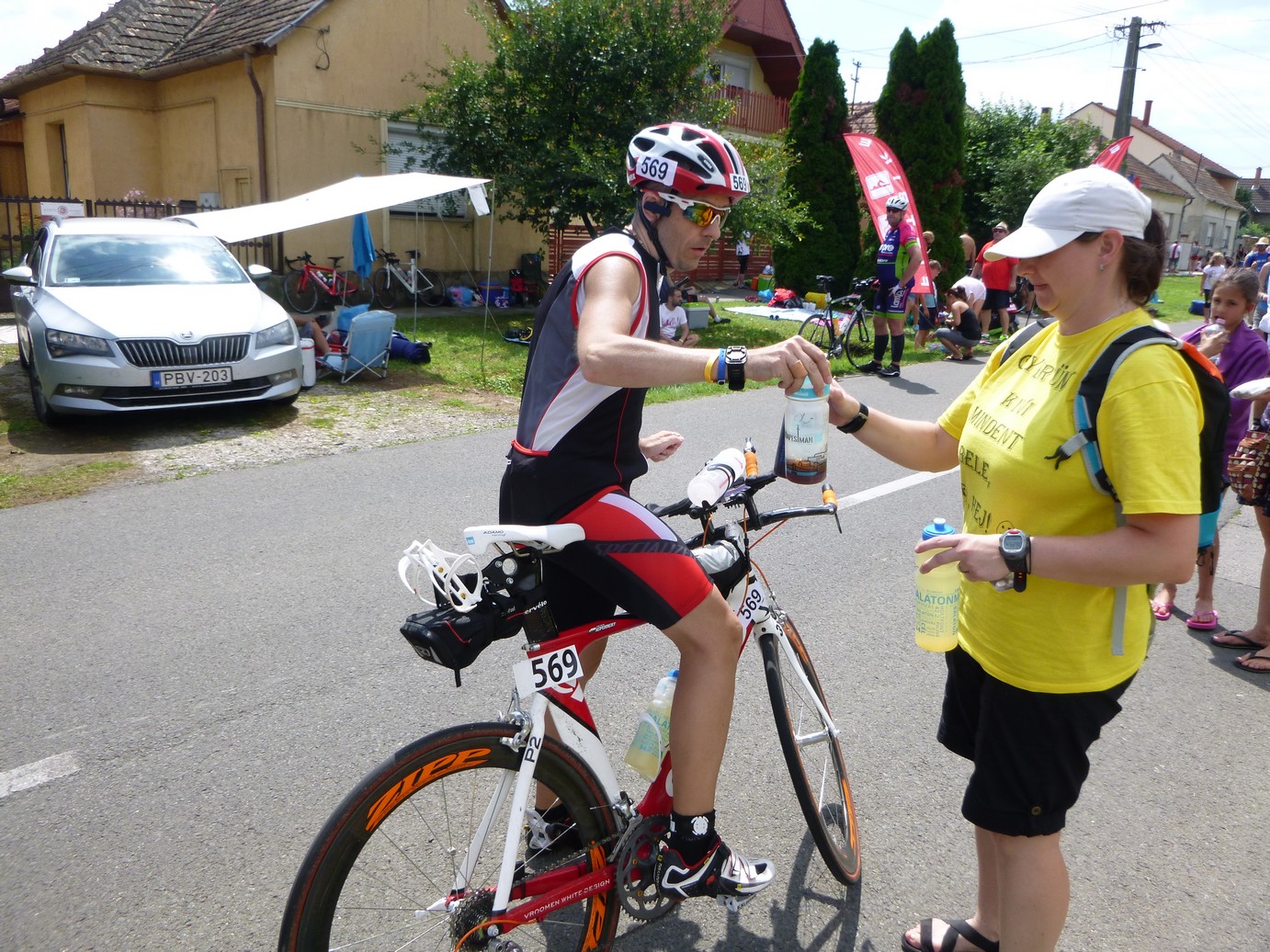 A kis körnek van egy általam eddig nem ismert szakasza, a nagyatádi elkerülő út. Hamarosan ráfordulok a körforgalomnál, tetszik. Odafelé enyhén lejt, és hibátlan az útminőség. Nincsenek szegélyező fák, szóval picit befúj a szél, a nap pedig éget, de jó ez az út. Hamarosan fordító, vissza a körforgalom felé. Nemsokára ismerős hang szólít meg, Csóka Bálint ér utol. Ő már a második körében van. Teljesen reális a hátrányom hozzá képest. Legalább 40 perccel jobbat úszott, és a bringán is gyorsabb volt. Pár szót váltunk, de a pulzusom kezdi elérni a 145-öt, így visszaveszek, Bálint pedig megy a dolgára. Ötvöskónyi felé hosszú enyhe lejtő, onnan Segesdig egy kisebb emelkedő boldogít, plusz egy vasúti felüljáró. Visszafelé ennek az ellenkezője. De nem nehéz az útvonal, erre a 35 kilométeres körre a 100m körüli szintkülönbség nem sok. És az is szépen eloszlik. Tartom az eddigi tempót, egyelőre várokozáson felül jól megy a bringa. Nem vagyok gyors, de jó az érzés, nem fáj semmi. Nagyon sokat számolgattam az edzések után, hogy ha X km távot Y m szinttel Z átlaggal tudok megtenni akkor a nagyatádi pályán (aminek az adatait ismertem, és Straván láttam a szintrajzát, de 10+ éve tekertem rajta utoljára) vajon mire lehetek képes. Izsó Lajos írta nekem korábban, hogy nyugodjak meg, nagytányéros lesz a pálya. Igaza van. Hogyne lenne igaza, 15-szörös nagyatádi Ironman. Néha-néha kicsire váltok, átpörgetem a lábaimat, de alapvetően tényleg nagytányéros a pálya. Közben Cilla jön szembe, ő most fejezi be a nagy kört. Jól mozog, van még benne erő, nagyon szorítok neki hogy a bringa szintidejét elérje. A segesdi dombtetőn frissítő és fordító. Csak vizet veszek fel, annak is a felét ellocsolom Nagyatádig, most már meleg van rendesen. Ötvöskónyiban az út szélén gyerekek kiabálnak: “Dobj egy csokit”, “Dobj egy kulacsot!”. Nincs üres kulacsom, telivel meg nem akarom lebombázni, kijönne a fél falu.