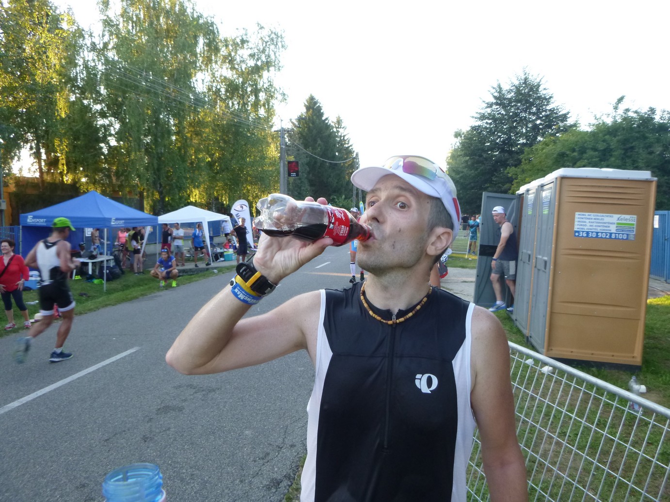 A bringára ülés pillanatától hetek óta rettegtem, a futás kezdetét viszont hetek óta vártam. Tudtam, hogy ha megvan a bringa szintidőn belül, és nem sérülök meg közben, akkor a futáson egész egyszerűen nem lehet nagy gond. Futottam már maratont többször is, ismerem a távot. Igaz, ilyen hosszú bemelegítés még egyszer sem volt előtte, de az edzéseken sokat gyakoroltam a hosszú bringa utáni hosszú futásokat (130+15, 100+20, ilyenek voltak többször is). Amitől féltem, az az, hogy fejben hogy fogom bírni. Lazán kezdek futni az első körben, a max. pulzust itt 150-re lőttem be. A pálya legelején Csűrös Róbert nyomja a dudát, pacsizunk és már futok is. A mozgásomat még rendeznem kell, de az első két kilométer 6 perces tempóban kifejezetten jól esik. A frissítési terv egyszerű volt. A kör elején Gabiék állnak, náluk van kóla, víz, sótabletta. A parkban odafelé csak a szivacsot vizezem be. A külső fordítónál kóla, víz, szivacs, a parkban visszafelé dinnye és szivacs, majd a versenyközpontban megint szivacs. Ez a terv, és ahogy haladunk előre az időben, ez ismétlődik minden körben. Az első locsolásnál elázik a csomag zsebkendő a hátsó zsebemben, remélem nem lesz rá szükség útközben. De legalább lehúzza a mezemet a súly…