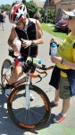 Elgyötörten jöttem ki a tóból, és vánszorogtam az öltözőbe. Ahogy sejteni a lehetett, a bringás zsákom kissé viharvert lett, gondolom páran ráléptek, belerúgtak, de benne volt minden, úgyhogy nem lehetett okom panaszra. A sátorban szokás szerint Bandi bácsival, Fröhlich Henrikkel öltöztem. Egy zselé és egy kis rizskoch volt a depós menü, öltözés közben ezeket termeltem be. A depózásom most 10:25 lett, két perccel jobb mint tavaly, de az úszásom meg néggyel rosszabb lett, szóval 2:15 körül kezdtem el a bringát. 5 percet hagytam a szintidőben a tavalyi 8-hoz képest.